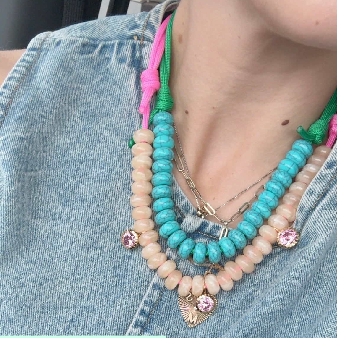 Kelly green paracord with turquoise acrylic beading. All made adjustable for length.
