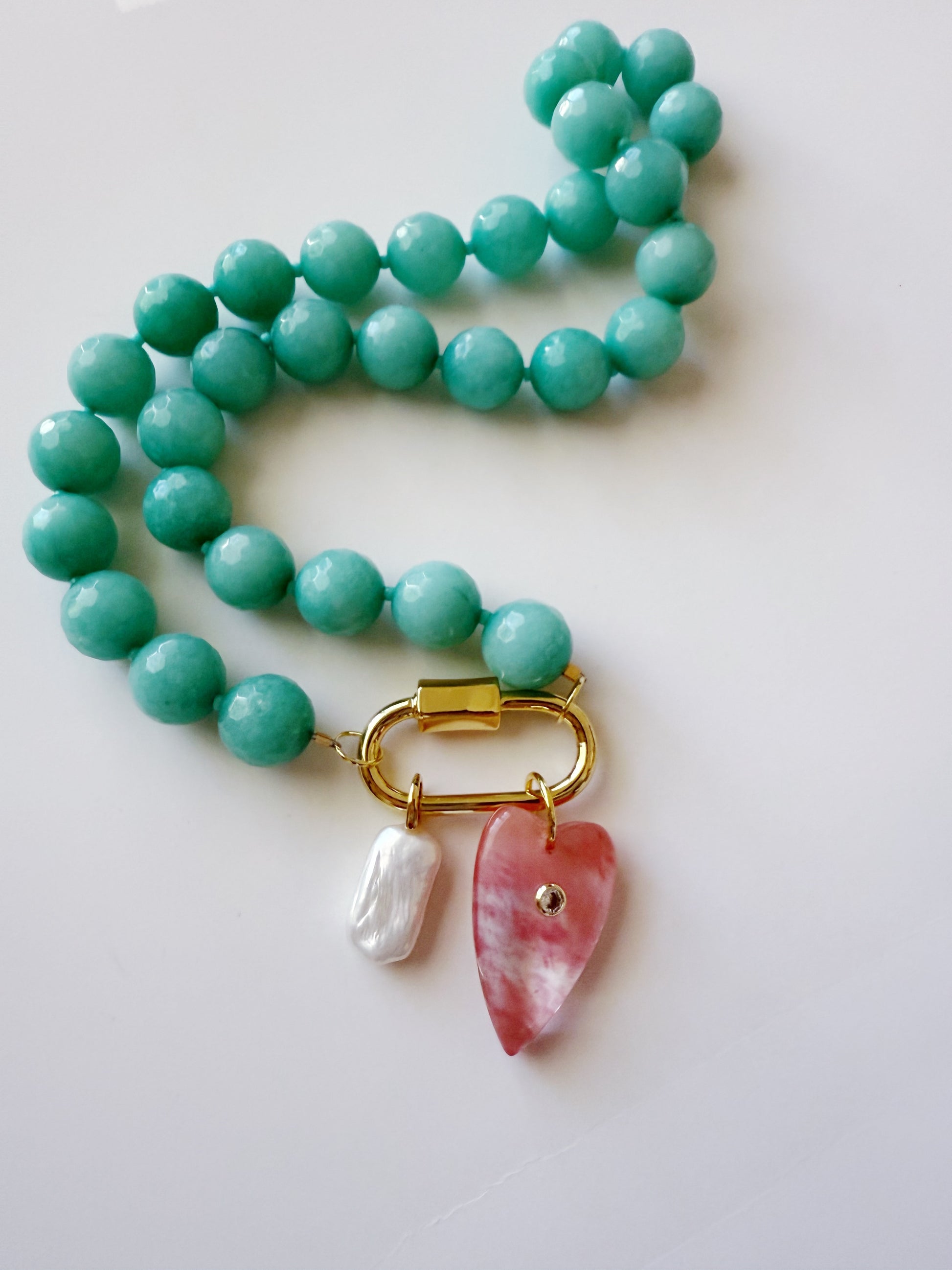 Extra large Jade can be a gemstone necklace with gold filled details. Comes with and extra large carabiner and two removable charms.