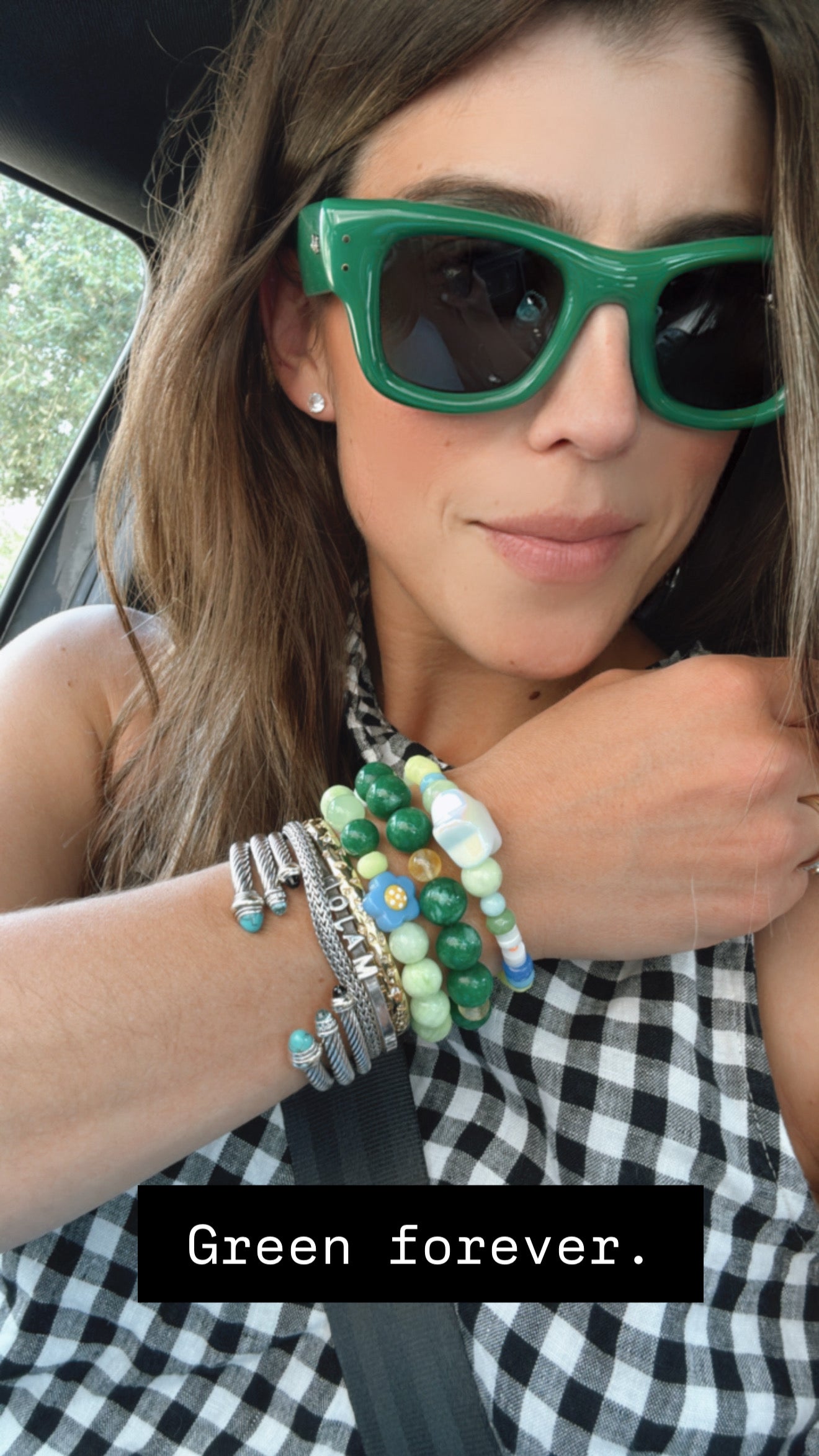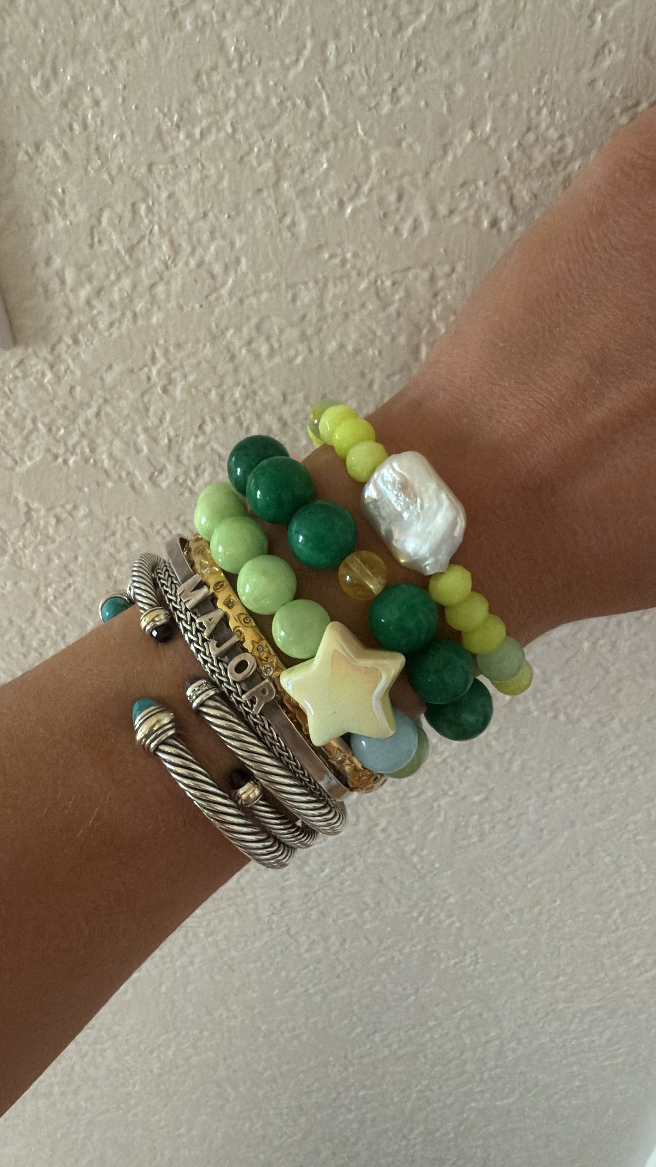 Jade green toned beads mixed with acrylic stars and flowers. A fun everyday wear! Fits small/medium wrist. One of a kind