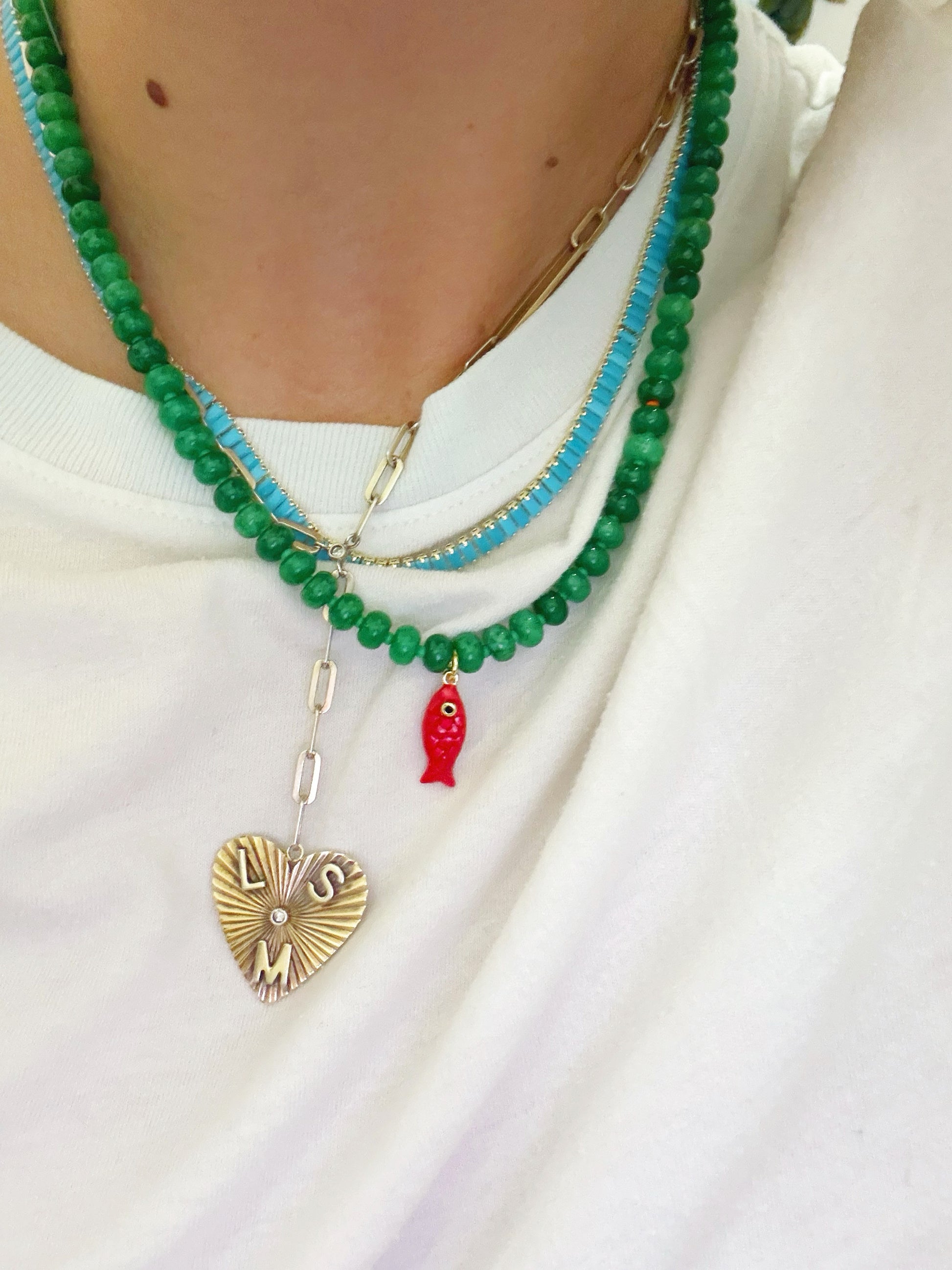 Hand beaded necklace, dyed jade green beads and a red fish pendant with gold filled details. 17-18”