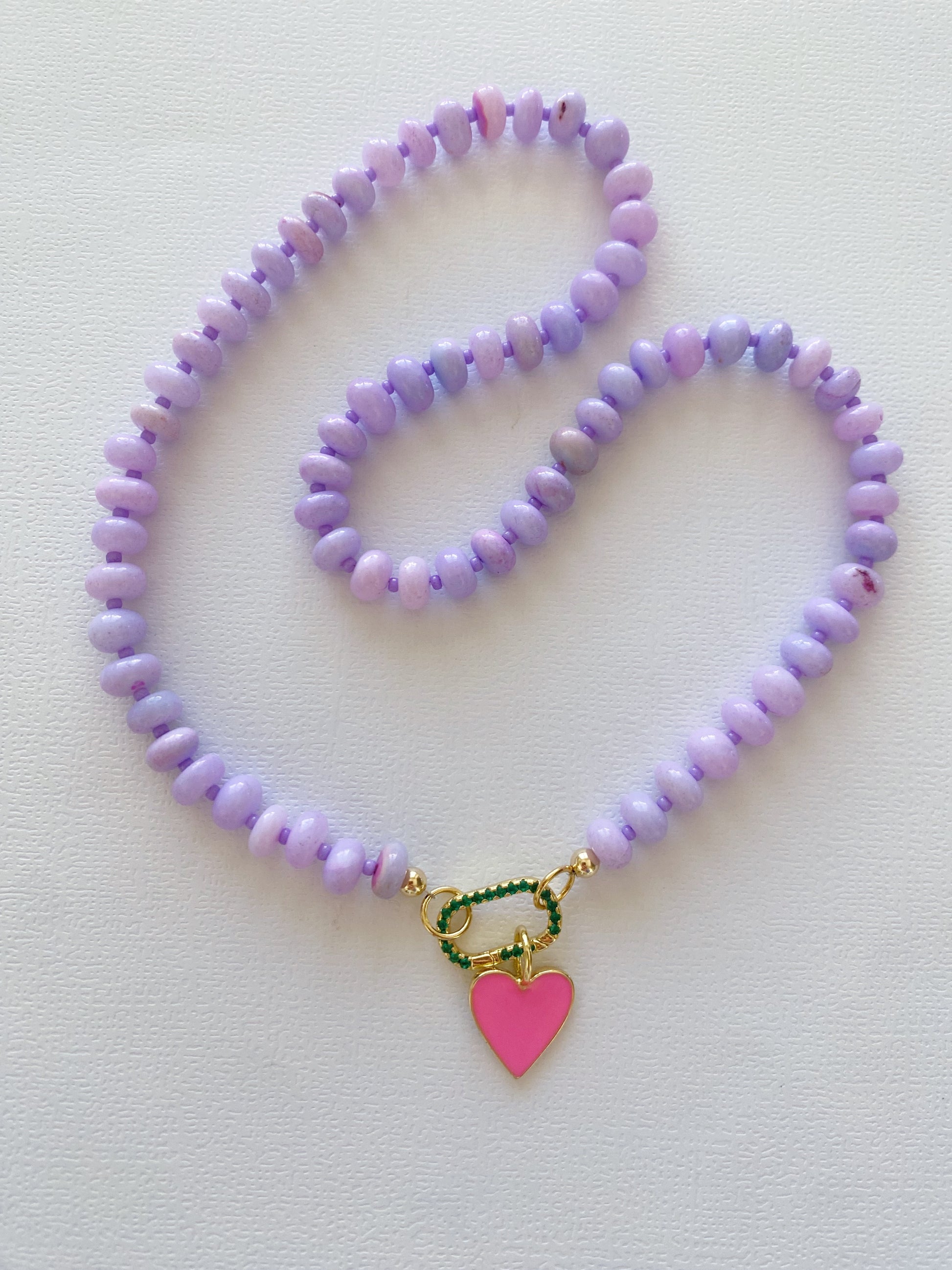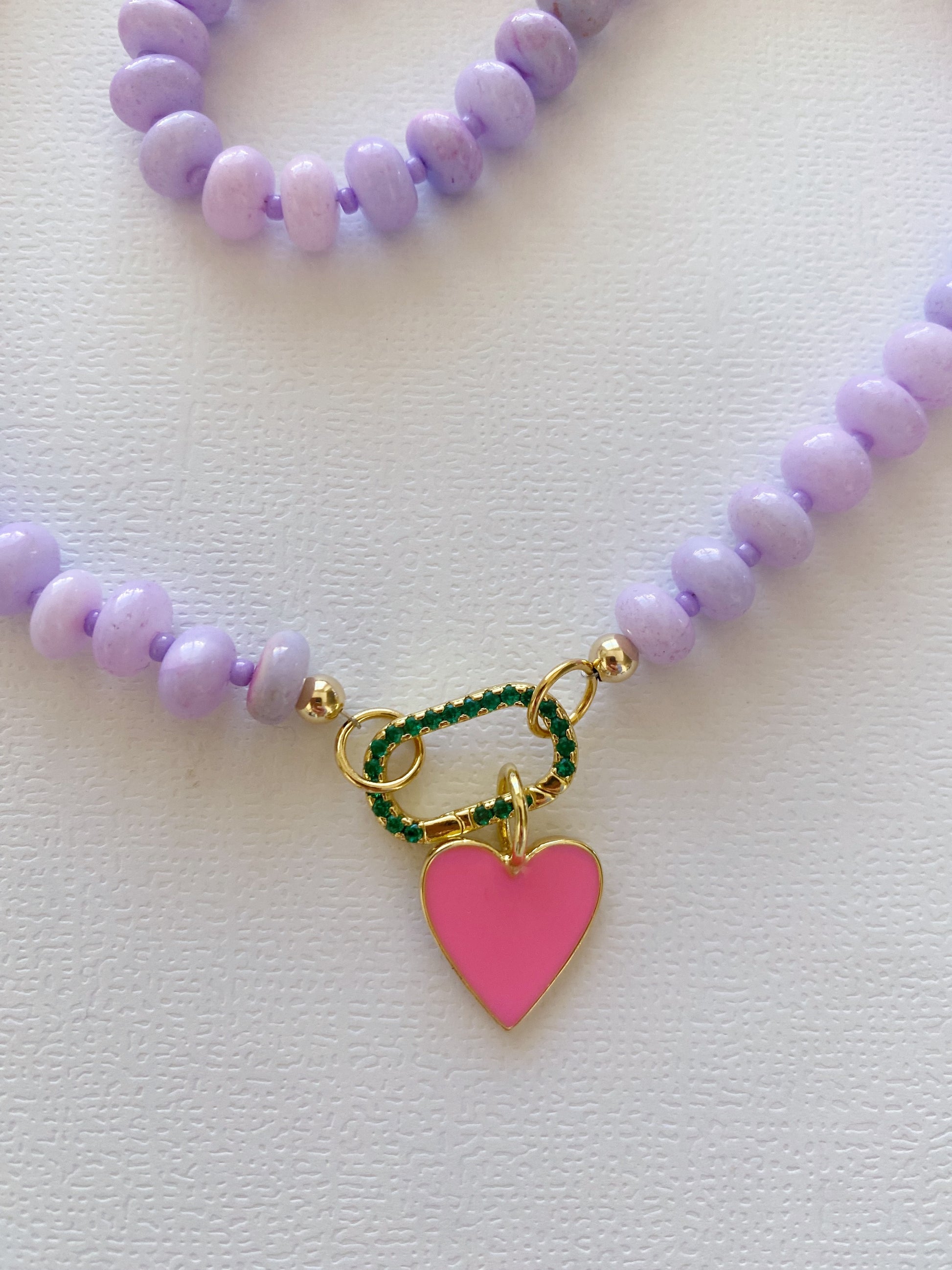 Lavender opals that are embellished with a gold filled clasp and cz emeralds. OPALS WILL VARY IN SHADE, NO TWO STRANDS ARE THE SAME . It comes with a small pink gold filled charm. You can also add any other charms you’d like as well. 💕 PRE-ORDER item
