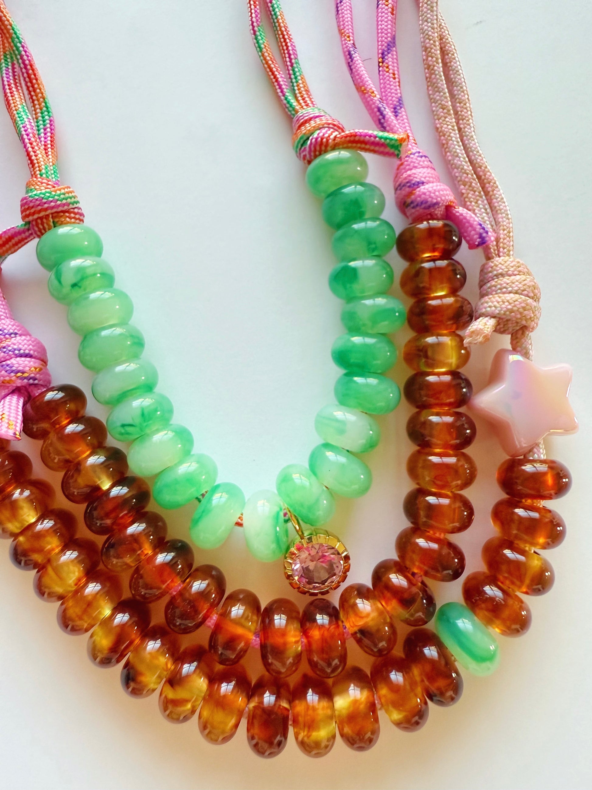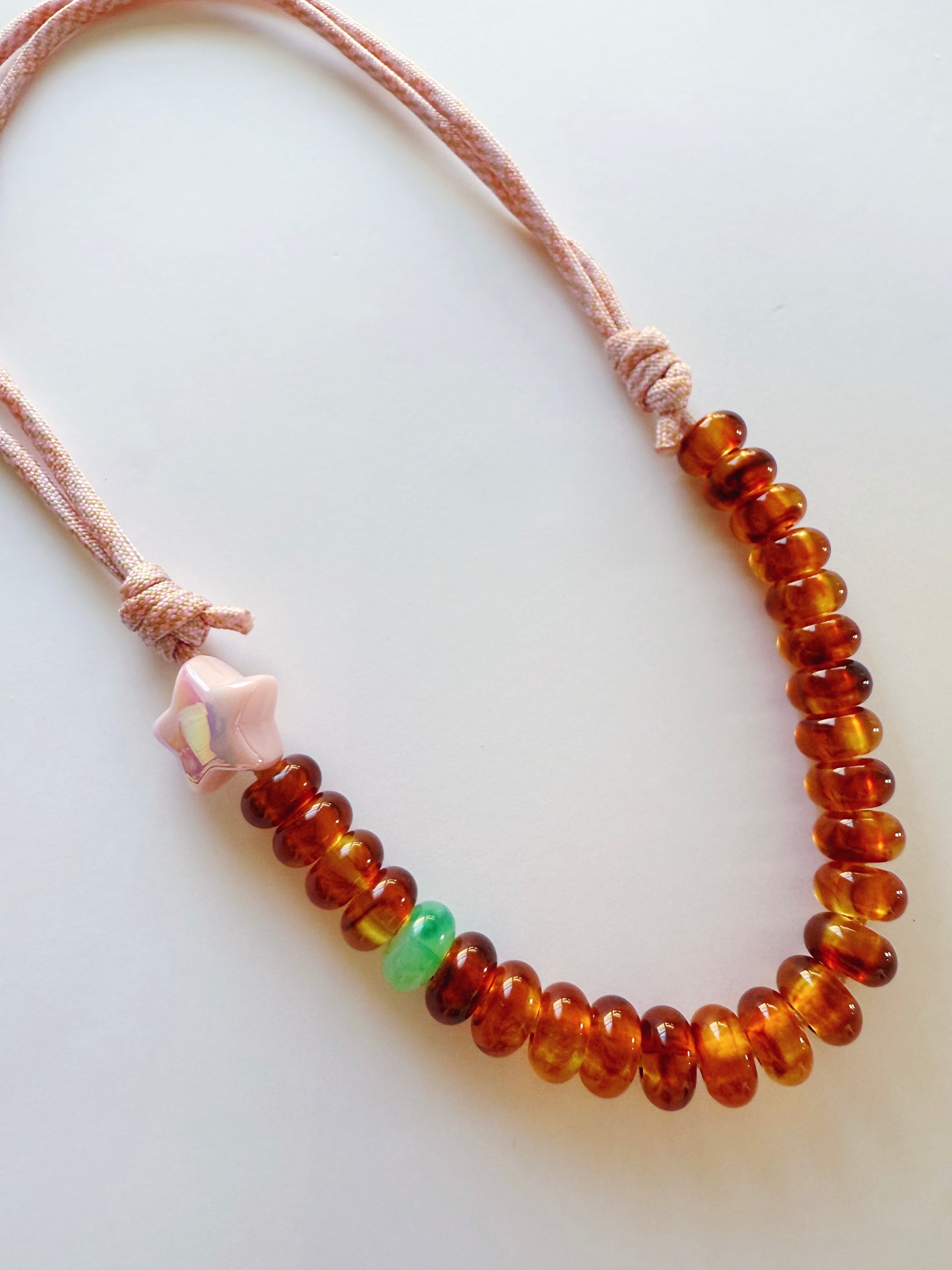Light pink toned paracord adjustable for length. Tortoise shade acrylic beads with one green and a light pink starburst. Ready to ship.