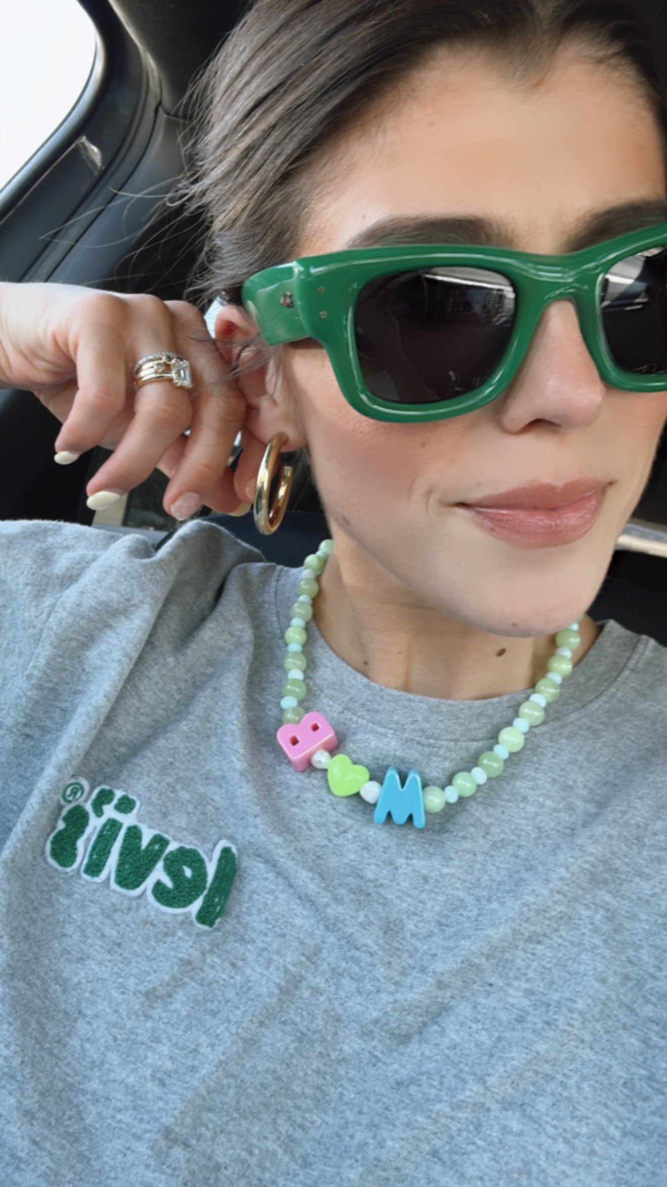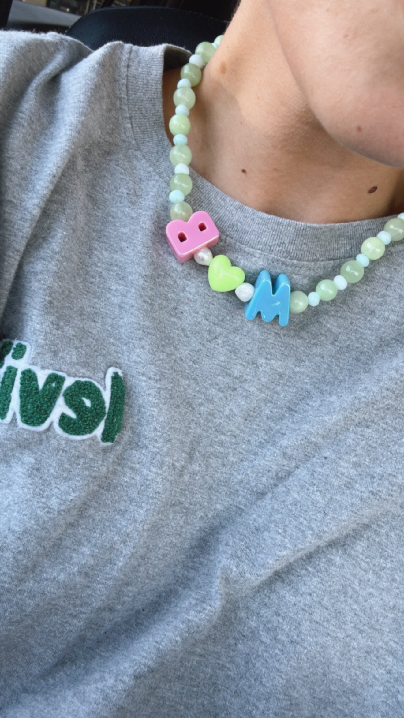 Custom initial necklace with jade beads and opals (imperfect). 18” long. Gold filled clasp and ring.
